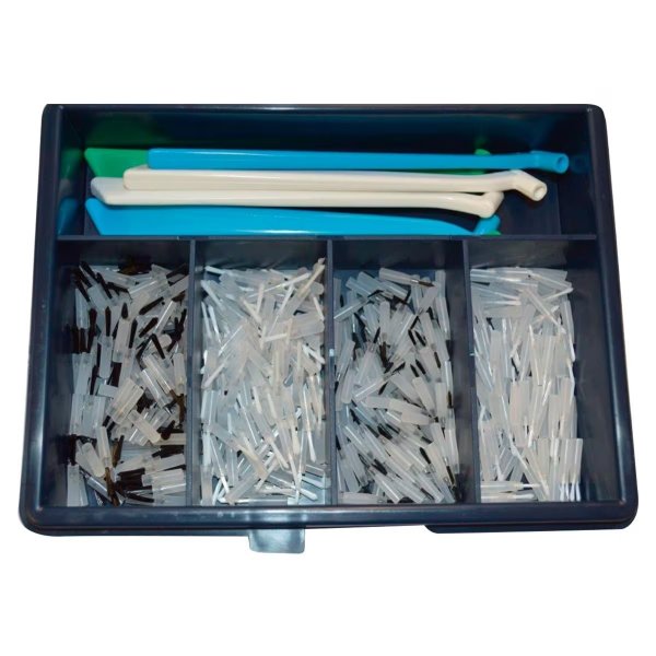Balenie: 4 x 100 ks (z každej veľkosti a farby, 6 x plastový držiak štetčekov.