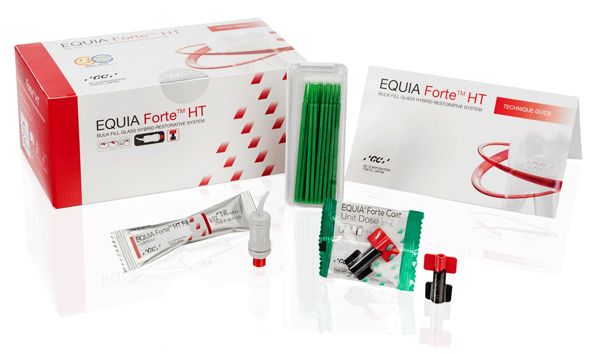 Chemicky tuhnúci bulk-filový materiál na dlhodobé terapeutické výplne v posteriórnej oblasti, používaný spolu s multifunkčným ochranným lakom Equia Forte Coat, zvyšujúcim povrchovú tvrdosť a odolnosť voči oteru. Prináša technológiu Glass Hybrid (hybridné sklené plnivo) a novú úroveň estetickej kvality výplní - HT znamená vysoko translucentná.  Glass Hybrid znamená inteligentnú distribúciu častíc a ich vzájomnú interakciu v pojive. Malé častice pôsobia ako lubrikant pre ľahké kontúrovanie a nelepivú konzistenciu a zároveň prepúšťajú viac svetla. Pevnosť v tlaku dosahuje úctyhodných 233 Mpa. Materiál je tolerantný voči vlhkosti, rýchlo spracovateľný (bez vrstvenia), má dlhší pracovný čas a kratší čas tuhnutia - celkovo trvá od aplikácie po nalakovanie cca 3 minúty 25 sekúnd.